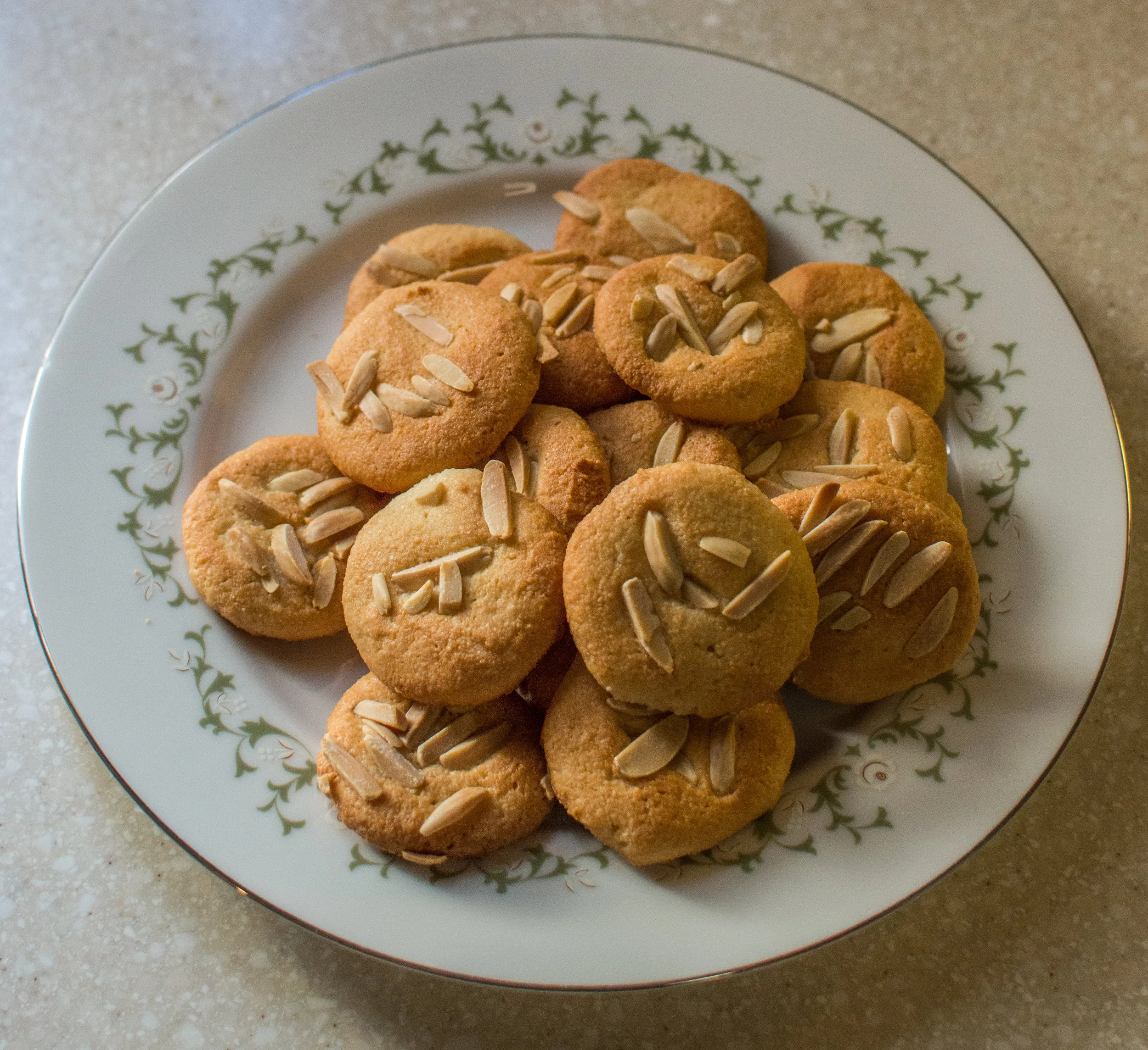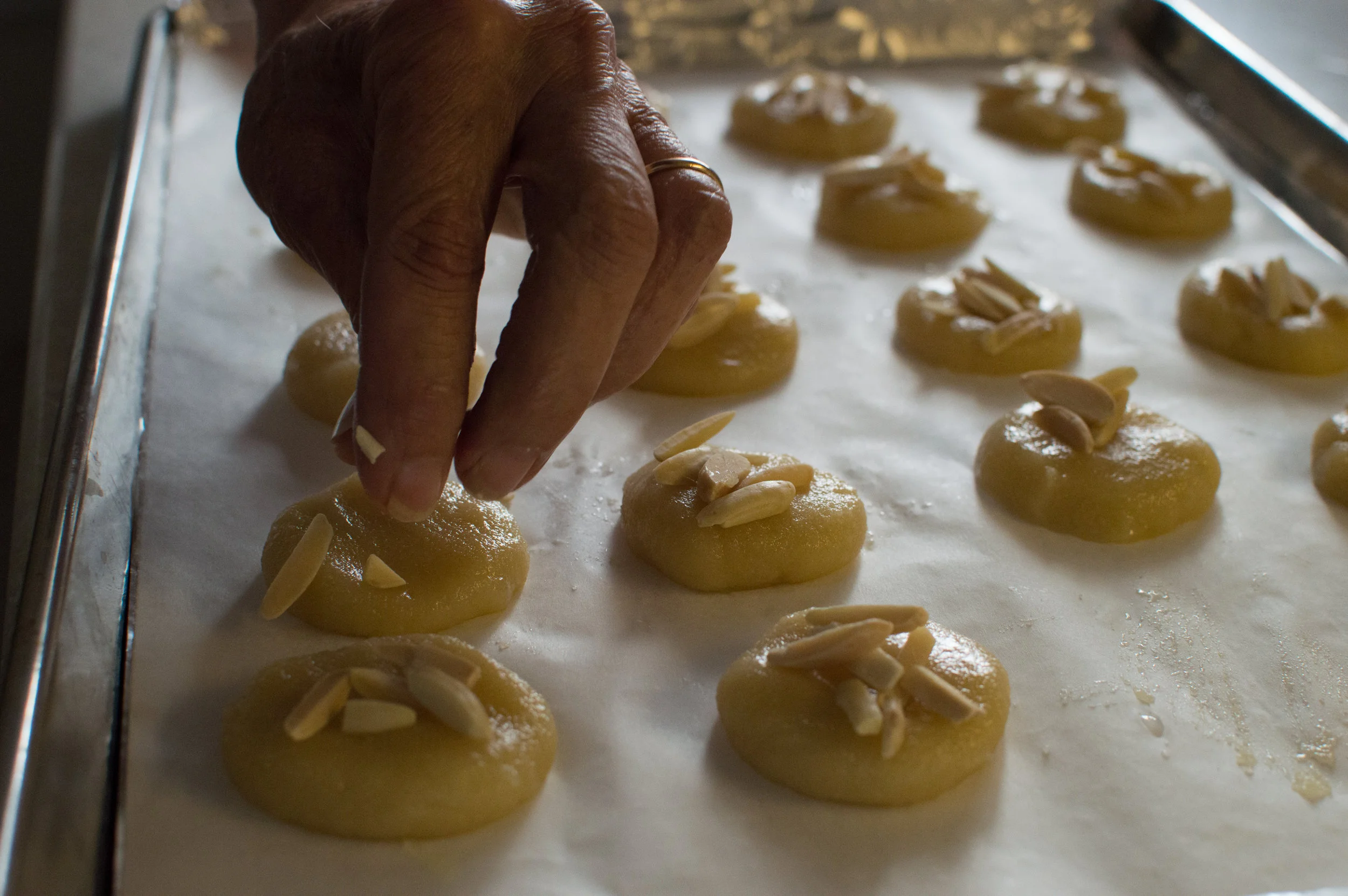 Roll the dough into small meatball-like balls and place on a baking sheet with parchment paper. With wet fingers, lightly dab on each and flatten out to create a dip. Sprinkle the slivered almonds on top and bake at 325 degrees for 20 minutes.