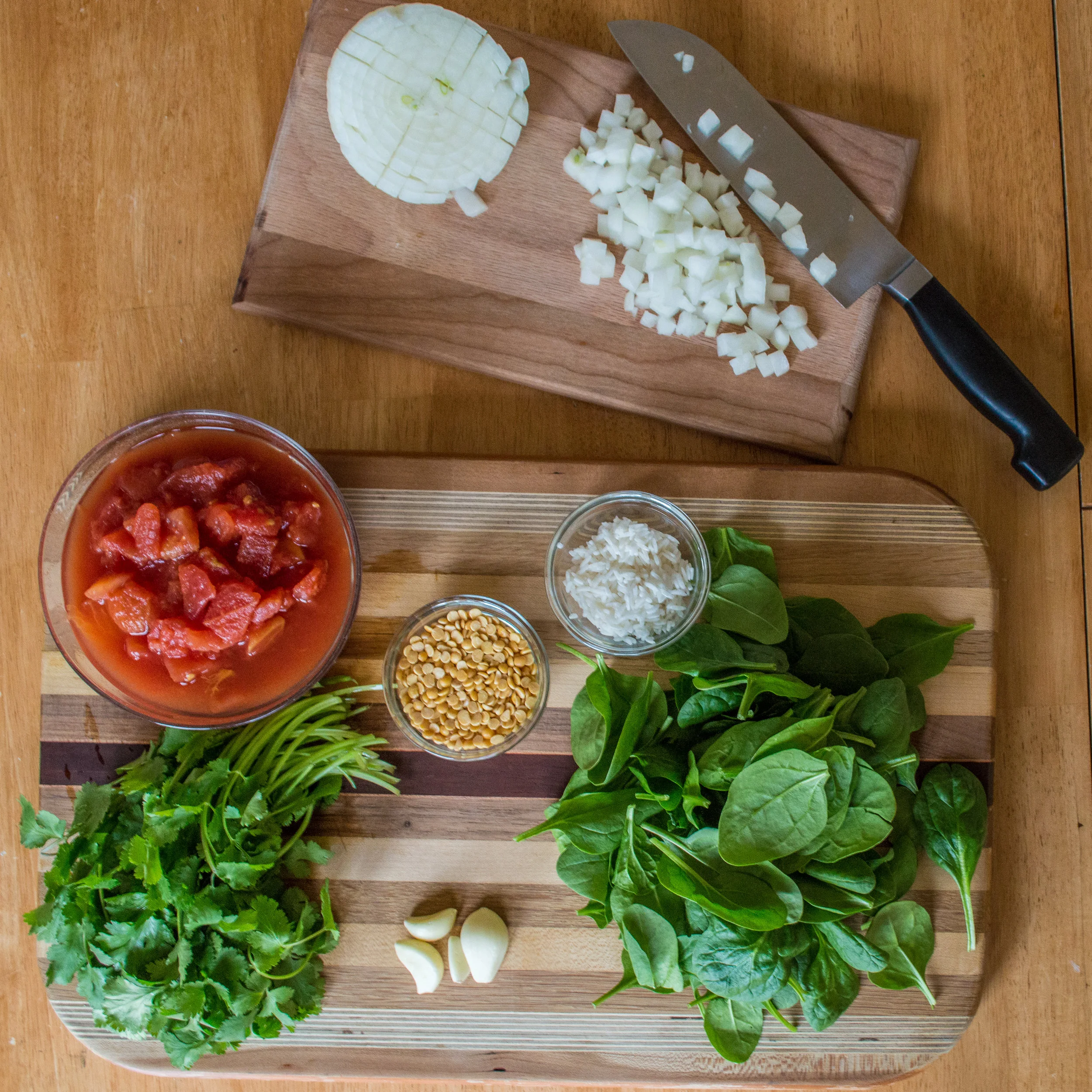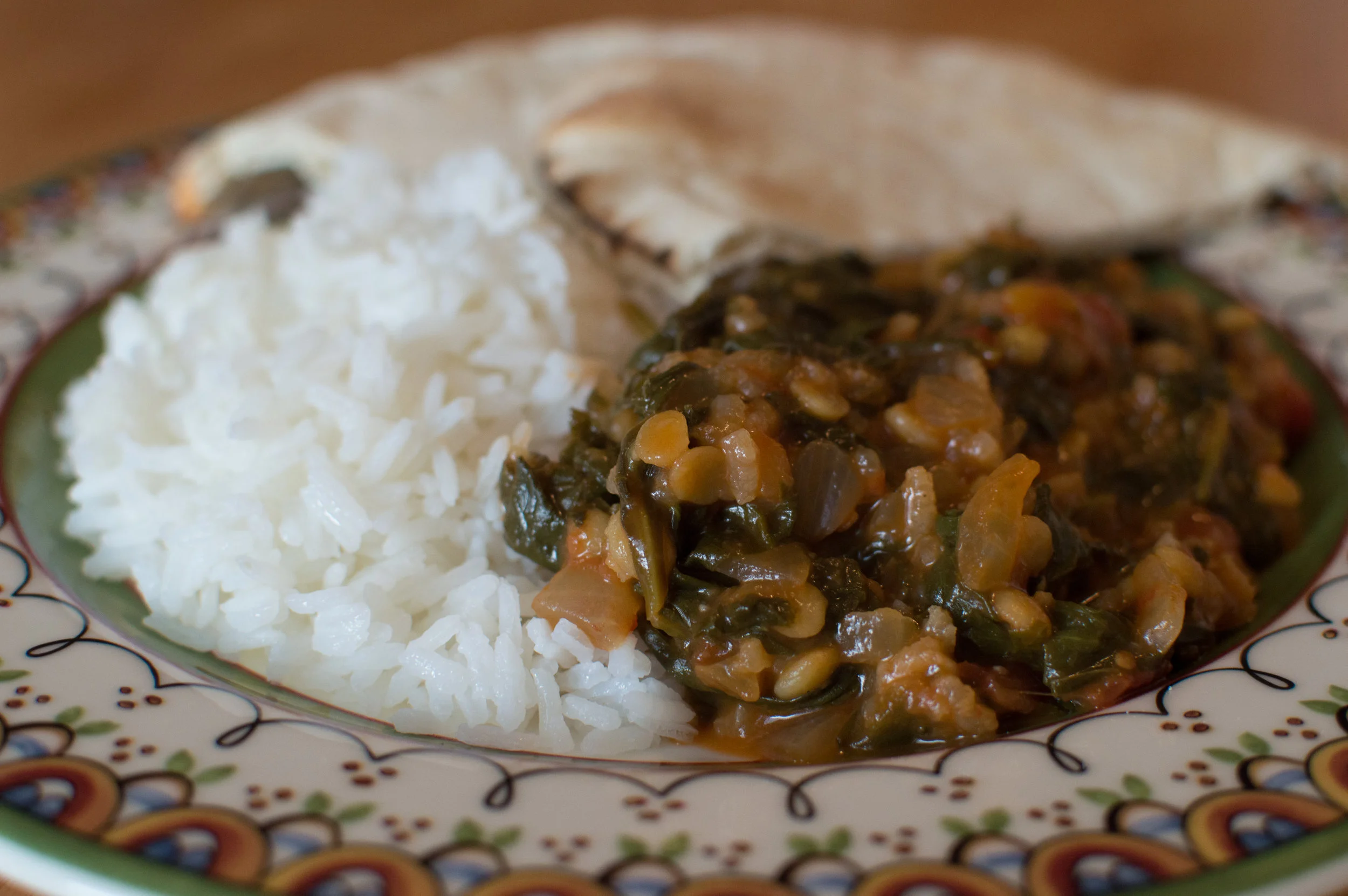 In this vegetarian dish, spinach and tomatoes are stewed with yellow split peas and served with rice. It can be served hot or cold.